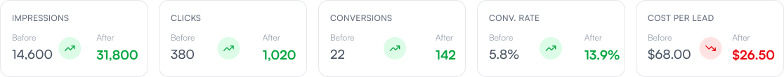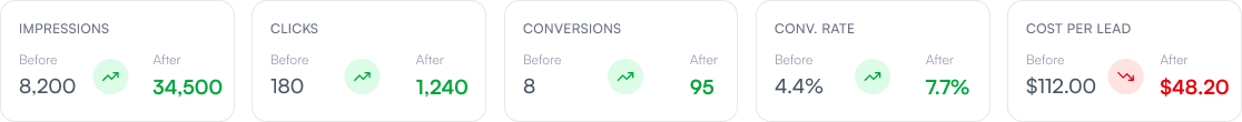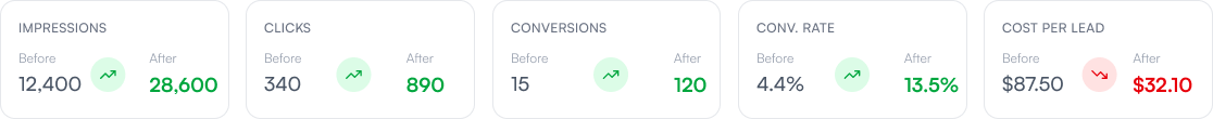 - Lead volume increased 5× while reducing cost per lead by 55%